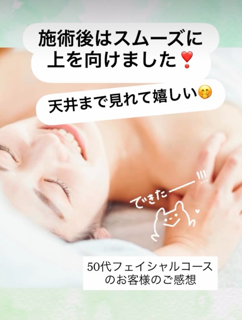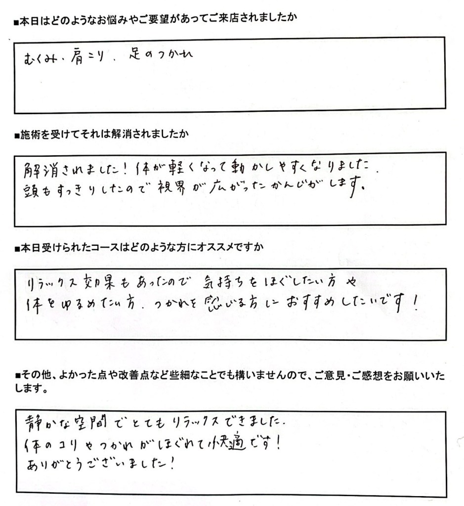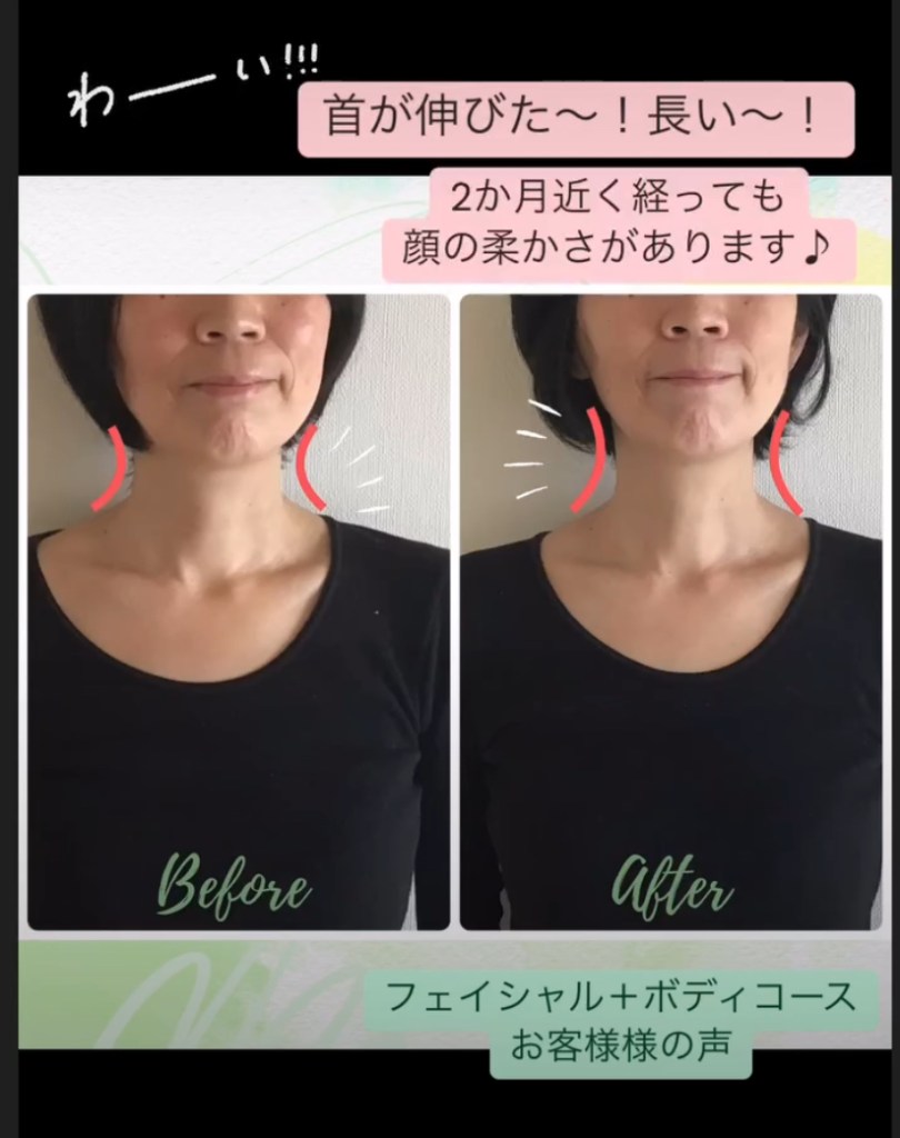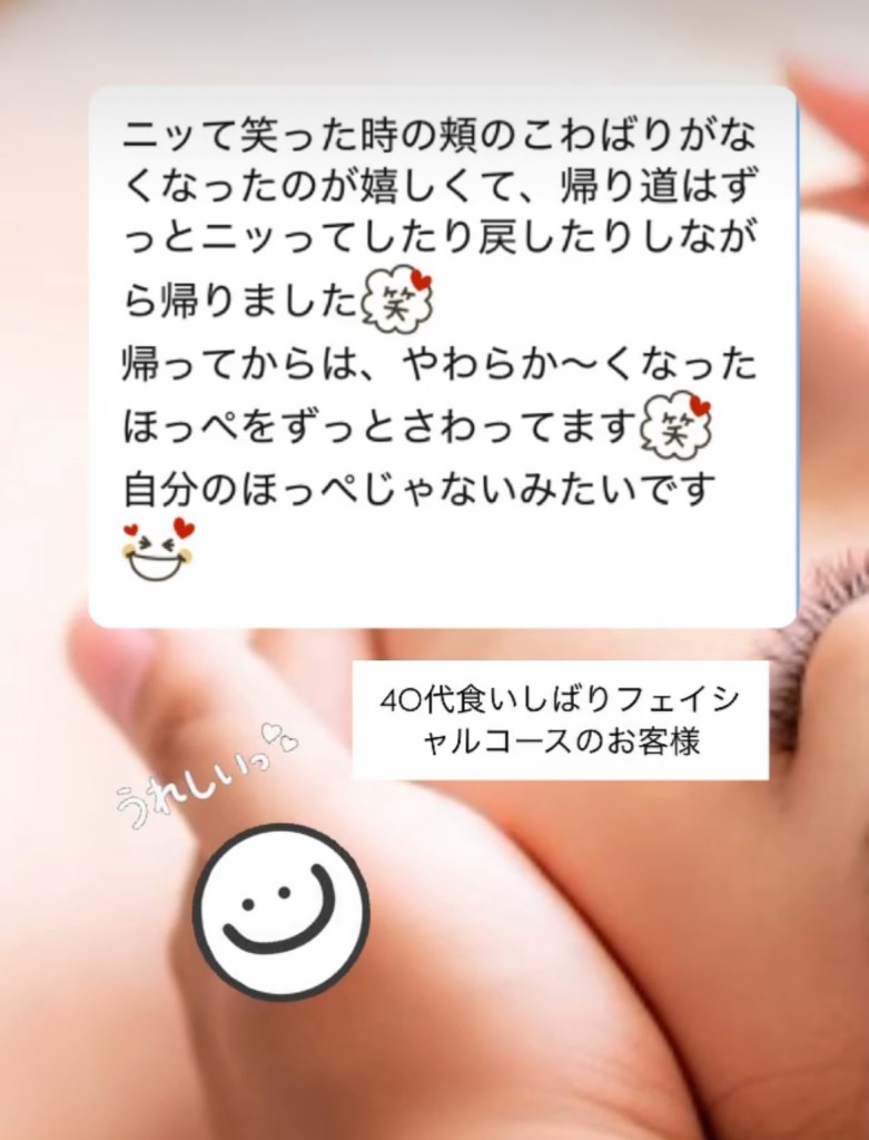 コリやむくみがあるとお身体がスッキリしませんよね。施術後の変化を感じていただけてよかったです。後日LINEで旦那様にお顔の変化に気づいていただけたとご連絡くださり私もうれしく思いました。