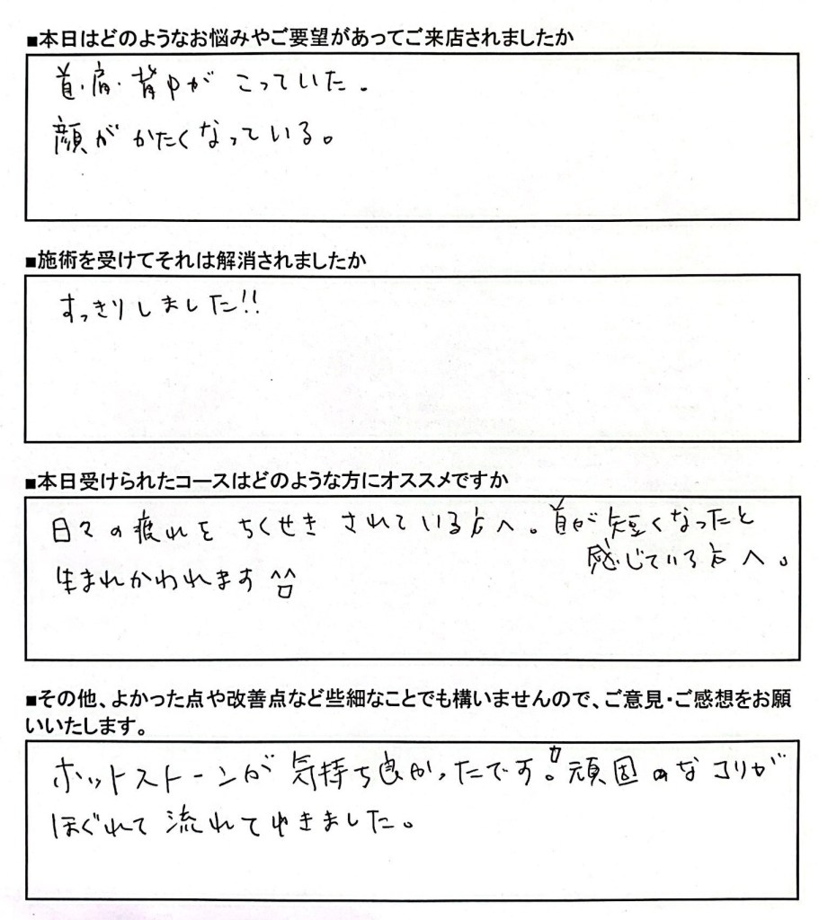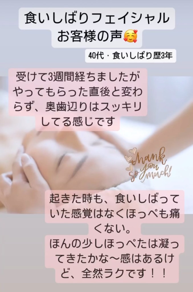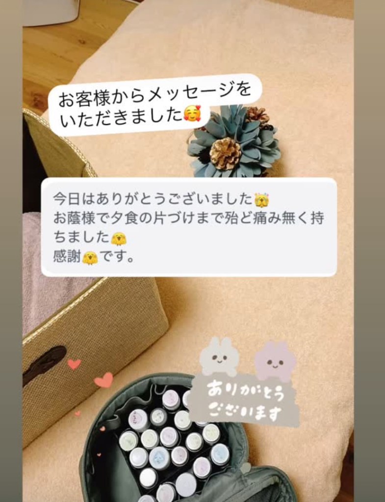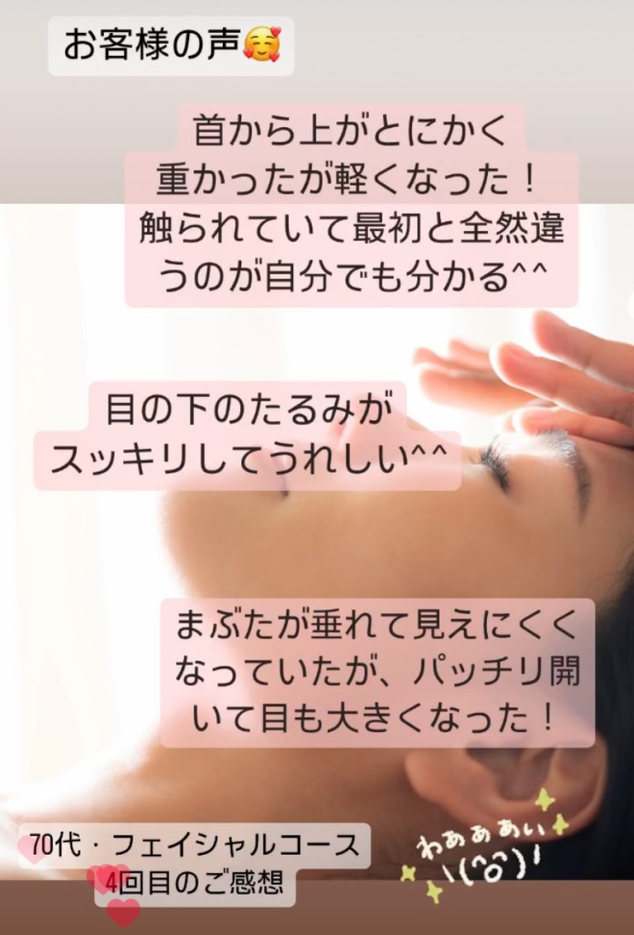 コリやむくみがあるとお身体がスッキリしませんよね。施術後の変化を感じていただけてよかったです。後日LINEで旦那様にお顔の変化に気づいていただけたとご連絡くださり私もうれしく思いました。