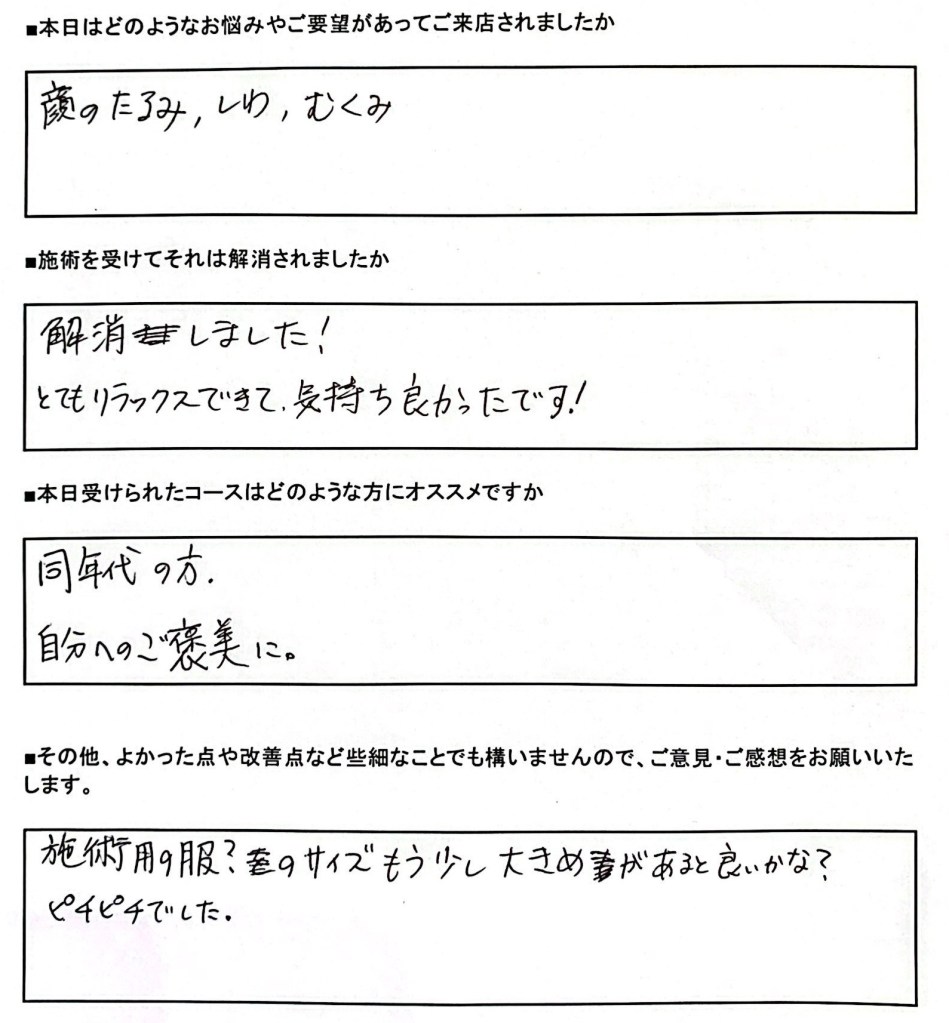 お顔のお悩みを解消するお手伝いができて私も嬉しいです。日々頑張っているご自身へのご褒美としてまたぜひご利用ください。ガウンはもう一つ大きいサイズを準備しましたので、次回はよりリラックスしてお過ごしいただけたらと思います。