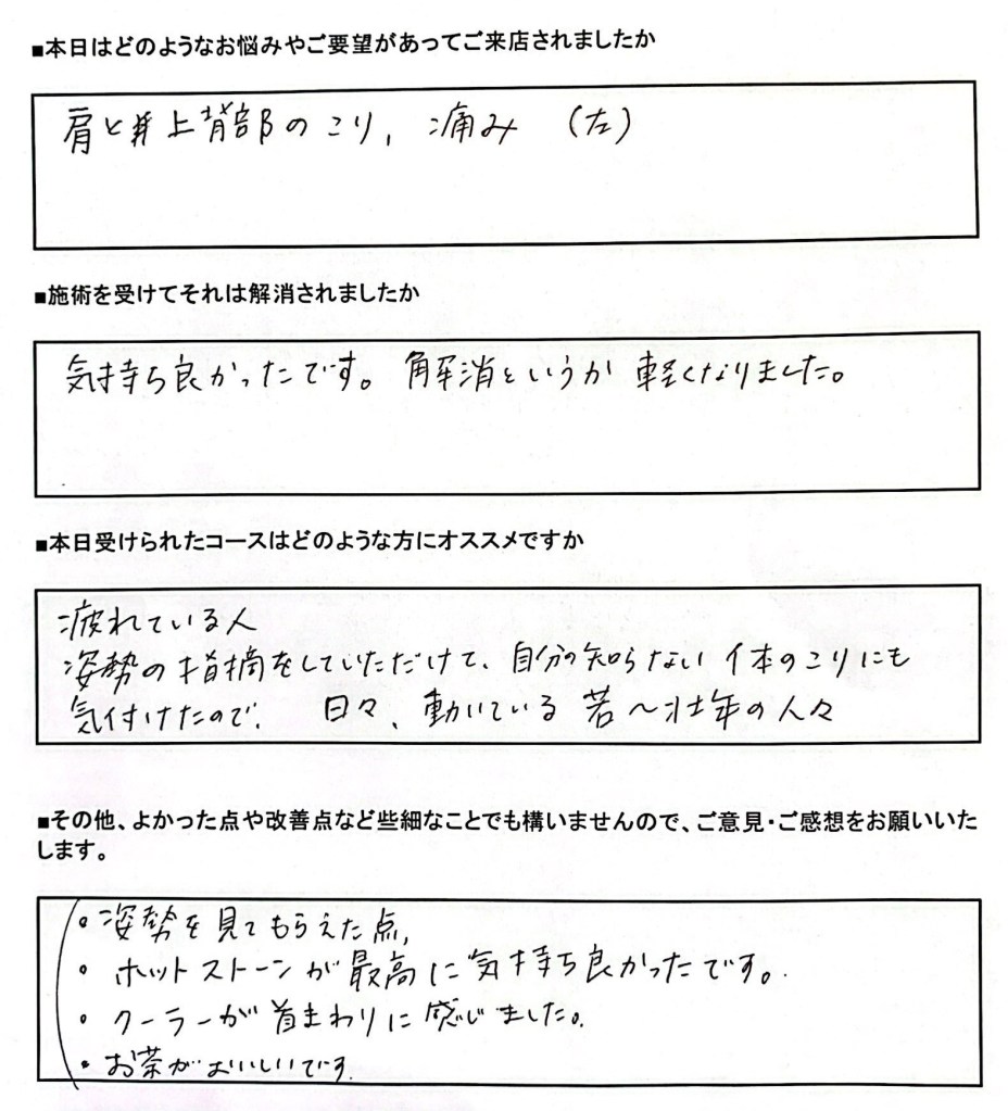 体がゆるんで軽くなると気持ちもほぐれますよね。施術後の体の快適さを感じていただけて私もうれしいです。首肩が固くなっておられたので、頭もほぐしていきましたが、視界が広がったと感じていただけたとのことでよかったです。