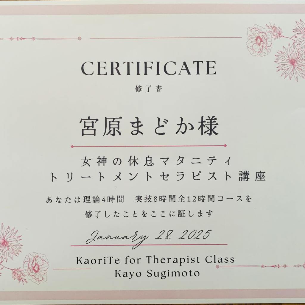 マタニティトリートメント講座、座学と実技の全過程を修了しました。