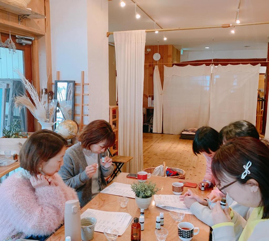 レッスンでは、お好きなアロマオイルをそれぞれブレンドしていただいた後、私が一度デモンストレーションを行い、そのあとは参加者さん同士でお互いにやっていただきました。