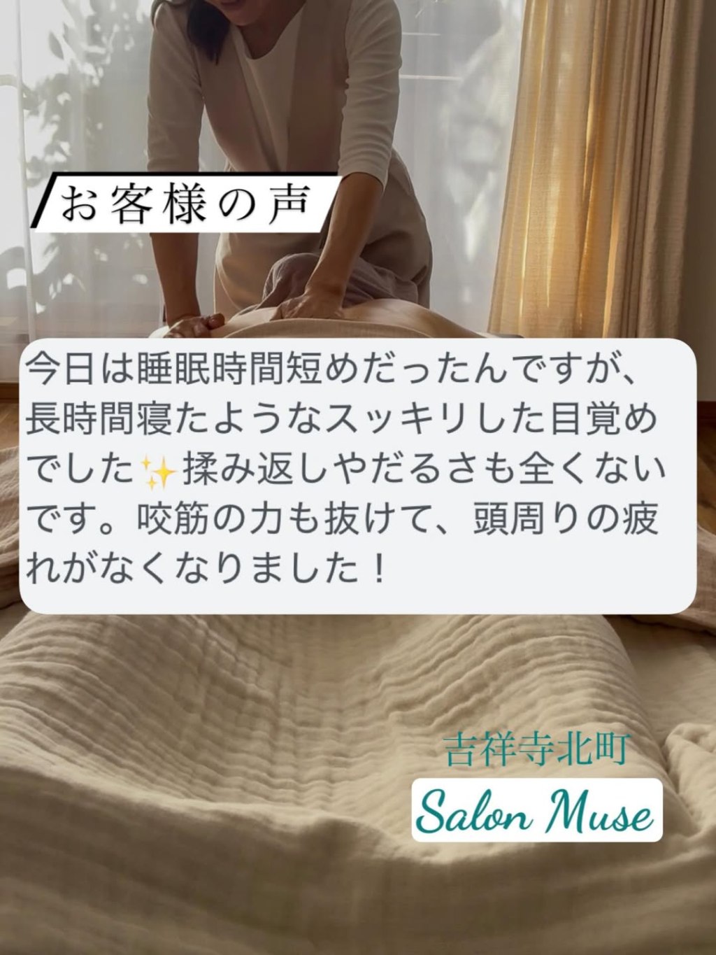 (食いしばりフェイシャル&ボディ120分コースのお客様より翌日のご感想)